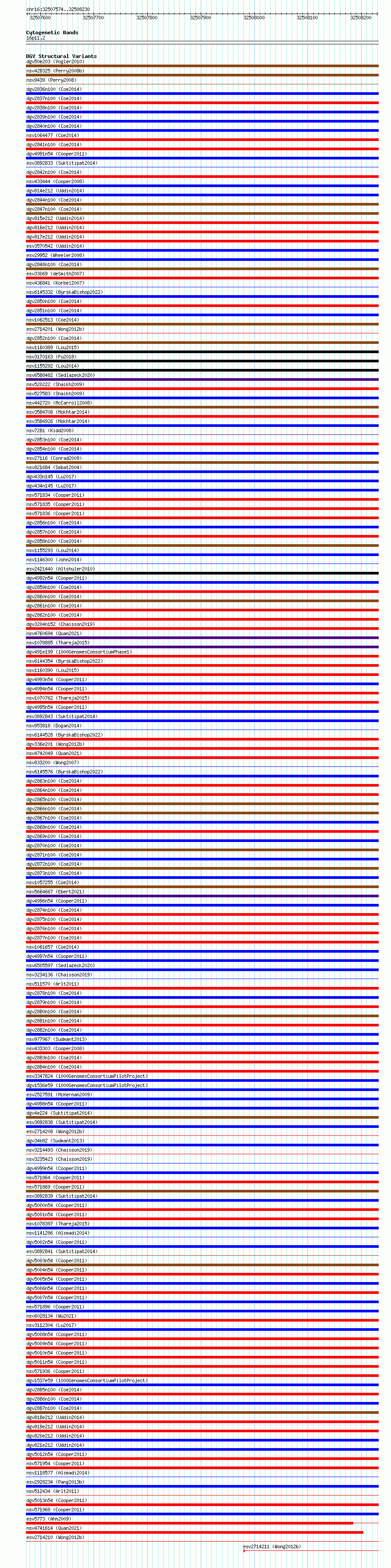 Variant DetailsVariant: essv6909359| Internal ID | 10018114 | | Landmark | | | Location Information | | | Cytoband | 16p11.2 | | Allele length | | Assembly | Allele length | | hg38 | 657 | | hg19 | 657 |