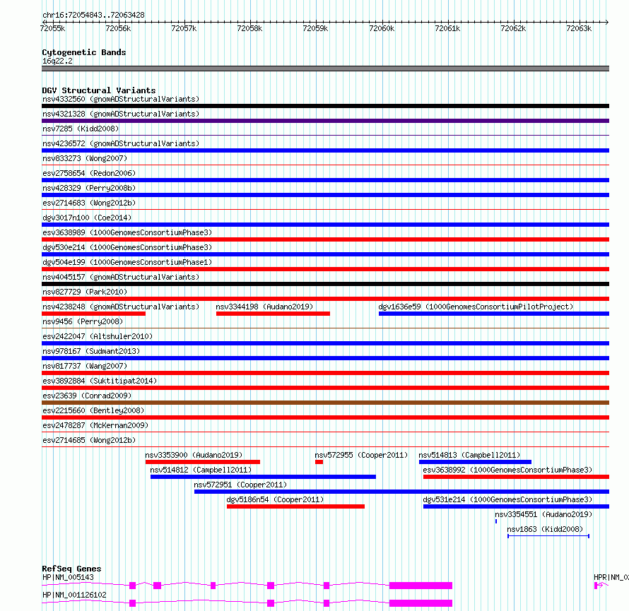 | Variant Type | CNV deletion | Copy Number | | Allele State | | Allele Origin | | Probe Count | | Validation Flag | | Merged Status | S | Merged Variants | esv2714685, esv2714683 | Supporting Variants | | Samples | SSM014 | Known Genes | HP, HPR | Method | Sequencing | Analysis | Breakdancer:4 times standard deviation,VariationHunter:4 times standard deviation and at least 3 supportting reads | Platform | Illumina HiSeq 2000 | Comments | | Reference | Wong_et_al_2012b | Pubmed ID | 23290073 | Accession Number(s) | essv6909446