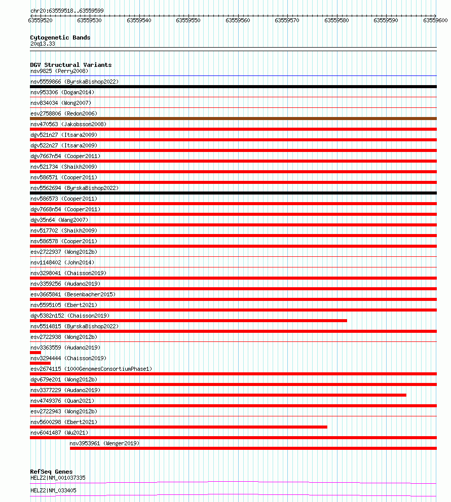 Variant DetailsVariant: essv6909737| Internal ID | 10017775 | | Landmark | | | Location Information | | | Cytoband | 20q13.33 | | Allele length | | Assembly | Allele length | | hg38 | 82 | | hg19 | 82 |