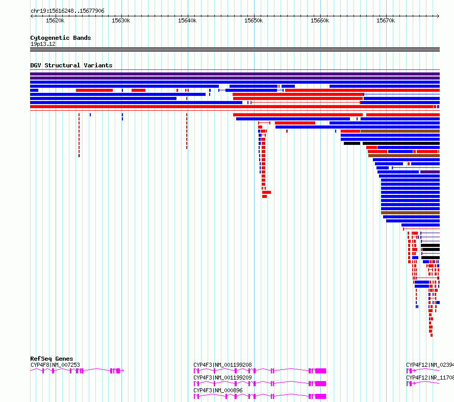 | | Variant Type | CNV deletion | | Copy Number | | | Allele State | | | Allele Origin | | | Probe Count | | | Validation Flag | | | Merged Status | S | | Merged Variants | esv2718235 | | Supporting Variants | | | Samples | SSM014 | | Known Genes | CYP4F12, CYP4F3, CYP4F8 | | Method | Sequencing | | Analysis | Breakdancer:4 times standard deviation,VariationHunter:4 times standard deviation and at least 3 supportting reads | | Platform | Illumina HiSeq 2000 | | Comments | | | Reference | Wong_et_al_2012b | | Pubmed ID | 23290073 | | Accession Number(s) | essv6909761