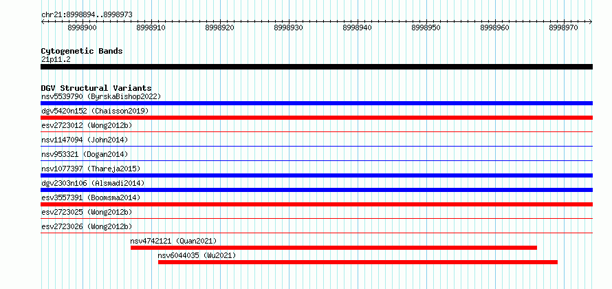 Variant DetailsVariant: essv6909916| Internal ID | 10017613 | | Landmark | | | Location Information | | | Cytoband | 21p11.2 | | Allele length | | Assembly | Allele length | | hg38 | 80 | | hg19 | 80 |