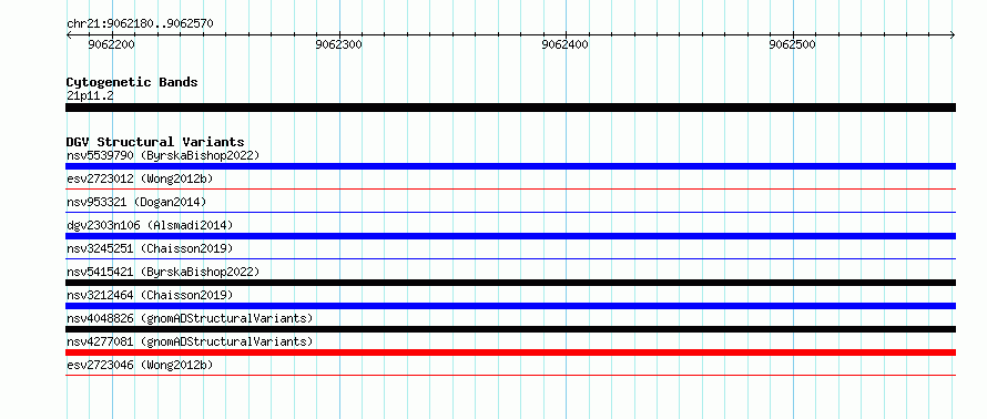 Variant DetailsVariant: essv6909918| Internal ID | 10017612 | | Landmark | | | Location Information | | | Cytoband | 21p11.2 | | Allele length | | Assembly | Allele length | | hg38 | 391 | | hg19 | 391 |