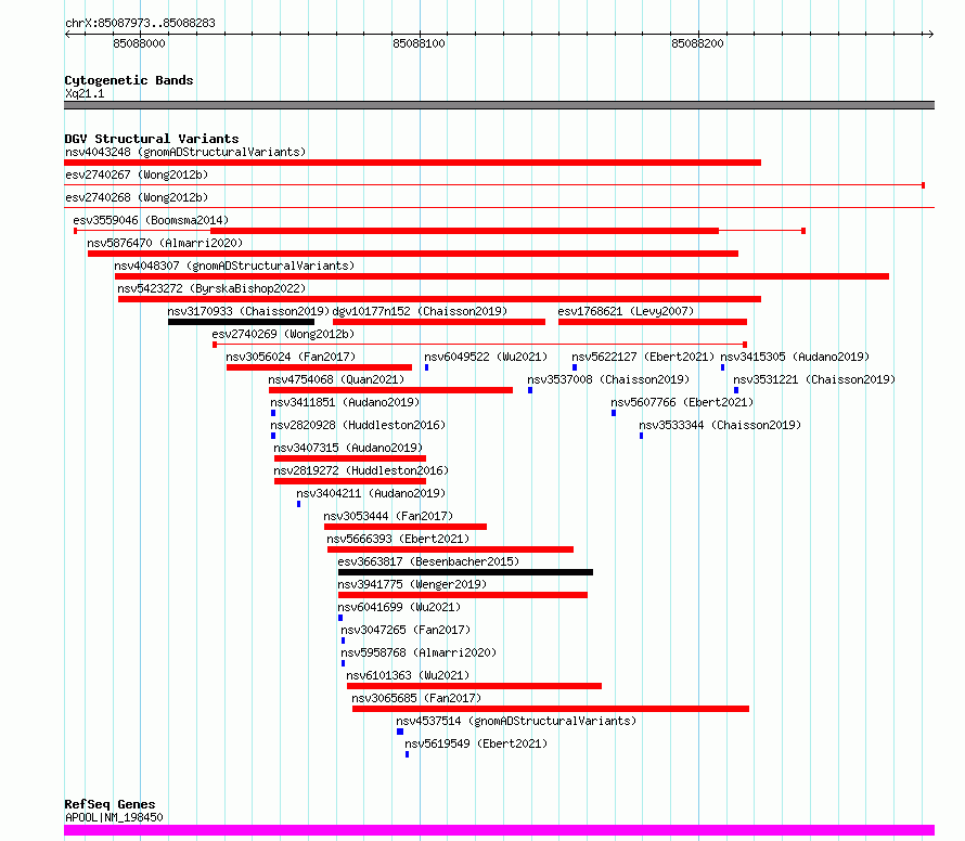| | Variant Type | CNV deletion | | Copy Number | | | Allele State | | | Allele Origin | | | Probe Count | | | Validation Flag | | | Merged Status | S | | Merged Variants | esv2740268, esv2740267 | | Supporting Variants | | | Samples | SSM015 | | Known Genes | APOOL | | Method | Sequencing | | Analysis | Breakdancer:4 times standard deviation,VariationHunter:4 times standard deviation and at least 3 supportting reads | | Platform | Illumina HiSeq 2000 | | Comments | | | Reference | Wong_et_al_2012b | | Pubmed ID | 23290073 | | Accession Number(s) | essv6911854