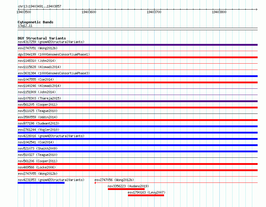 Variant DetailsVariant: essv6912721| Internal ID | 9675015 | | Landmark | | | Location Information | | | Cytoband | 13q12.11 | | Allele length | | Assembly | Allele length | | hg38 | 367 | | hg19 | 367 |