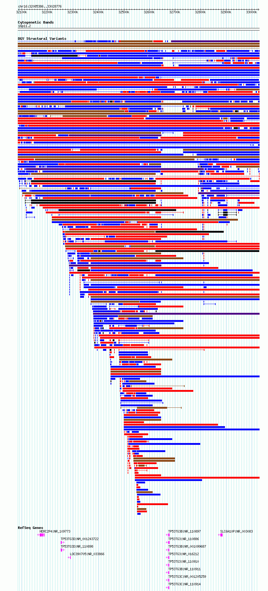 | | Variant Type | CNV deletion | | Copy Number | | | Allele State | | | Allele Origin | | | Probe Count | | | Validation Flag | | | Merged Status | S | | Merged Variants | esv2714201 | | Supporting Variants | | | Samples | SSM015 | | Known Genes | HERC2P4, LOC390705, SLC6A10P, TP53TG3, TP53TG3B, TP53TG3C, TP53TG3D | | Method | Sequencing | | Analysis | Breakdancer:4 times standard deviation,VariationHunter:4 times standard deviation and at least 3 supportting reads | | Platform | Illumina HiSeq 2000 | | Comments | | | Reference | Wong_et_al_2012b | | Pubmed ID | 23290073 | | Accession Number(s) | essv6913092