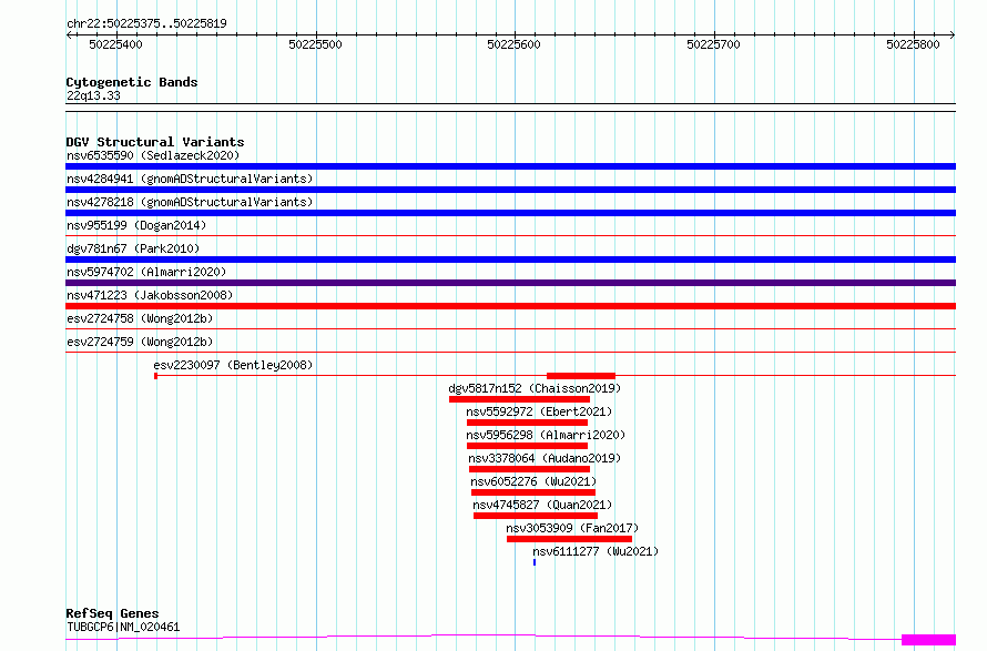 Variant DetailsVariant: essv6913856| Internal ID | 10024233 | | Landmark | | | Location Information | | | Cytoband | 22q13.33 | | Allele length | | Assembly | Allele length | | hg38 | 445 | | hg19 | 445 |