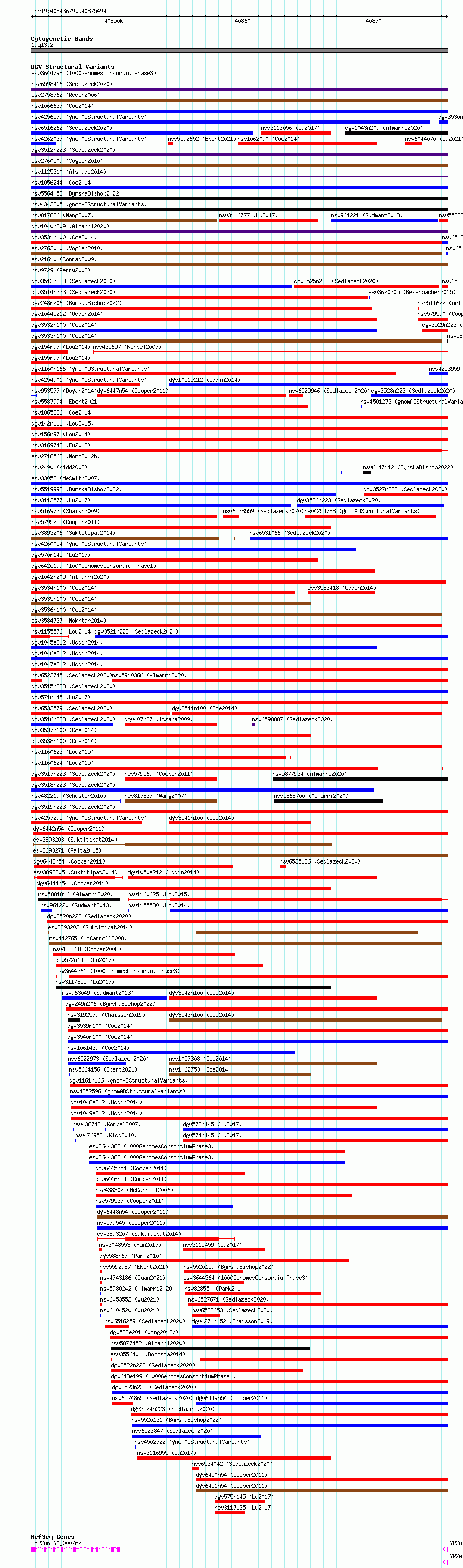 Variant DetailsVariant: essv6914841| Internal ID | 9984770 | | Landmark | | | Location Information | | | Cytoband | 19q13.2 | | Allele length | | Assembly | Allele length | | hg38 | 31816 | | hg19 | 31816 |