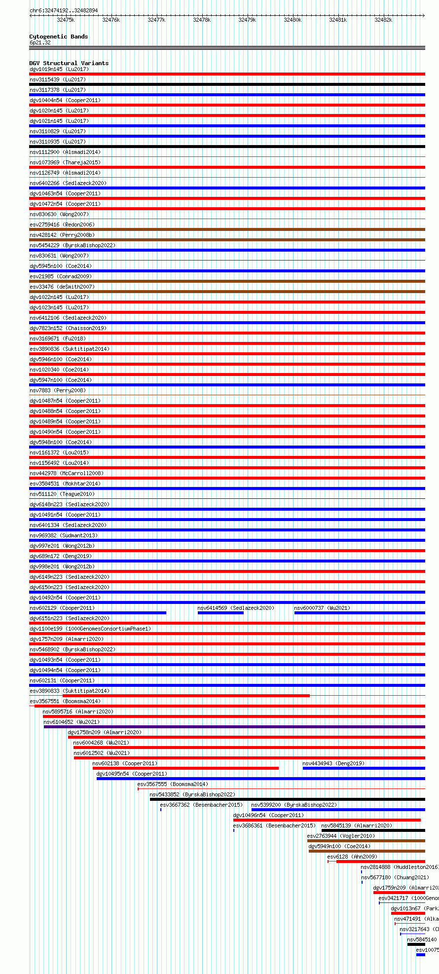 Variant DetailsVariant: essv6915042| Internal ID | 10026112 | | Landmark | | | Location Information | | | Cytoband | 6p21.32 | | Allele length | | Assembly | Allele length | | hg38 | 8703 | | hg19 | 8703 |