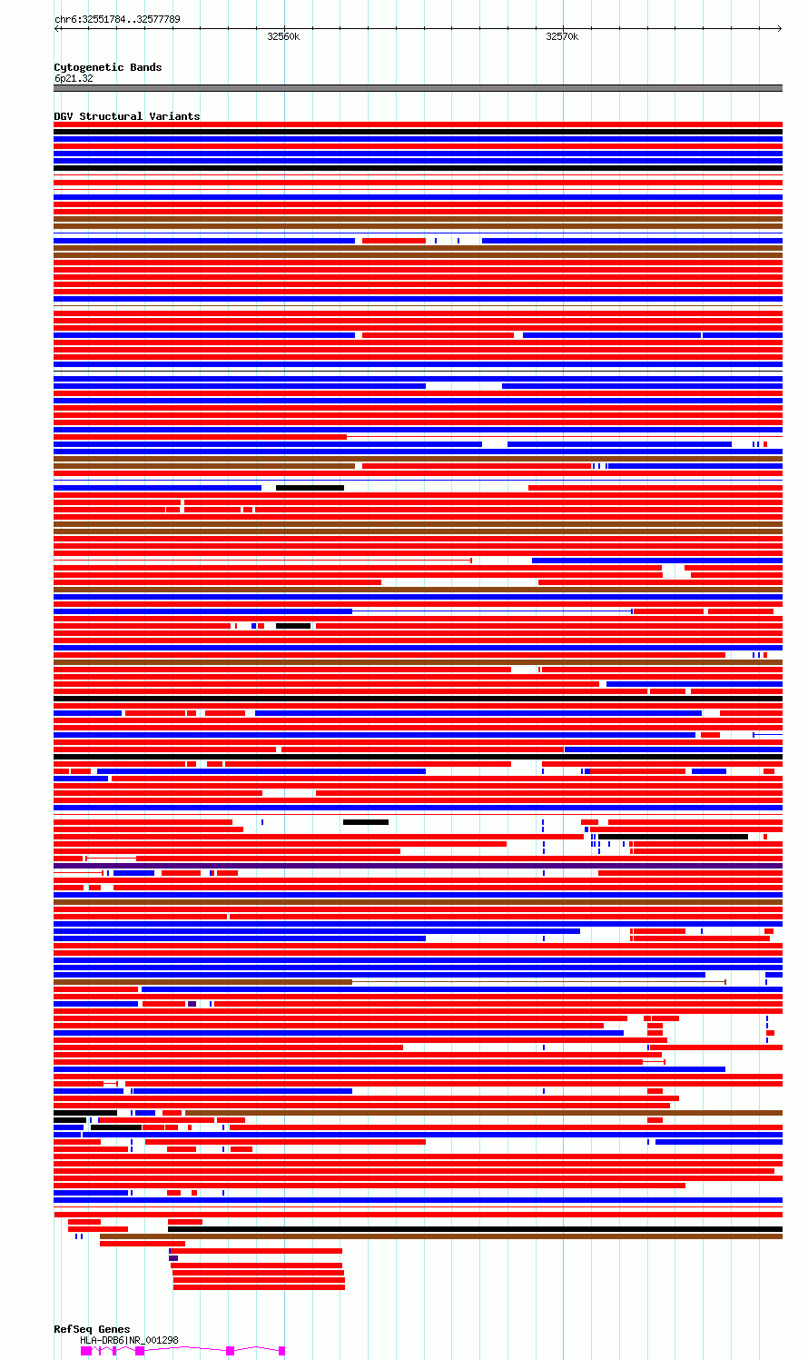 Variant DetailsVariant: essv6915071| Internal ID | 10026139 | | Landmark | | | Location Information | | | Cytoband | 6p21.32 | | Allele length | | Assembly | Allele length | | hg38 | 26006 | | hg19 | 26006 |