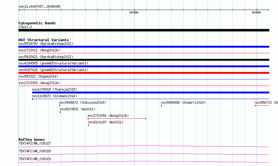 Variant DetailsVariant: essv6915896| Internal ID | 9984663 | | Landmark | | | Location Information | | | Cytoband | 21p11.2 | | Allele length | | Assembly | Allele length | | hg38 | 2039 | | hg19 | 2039 |