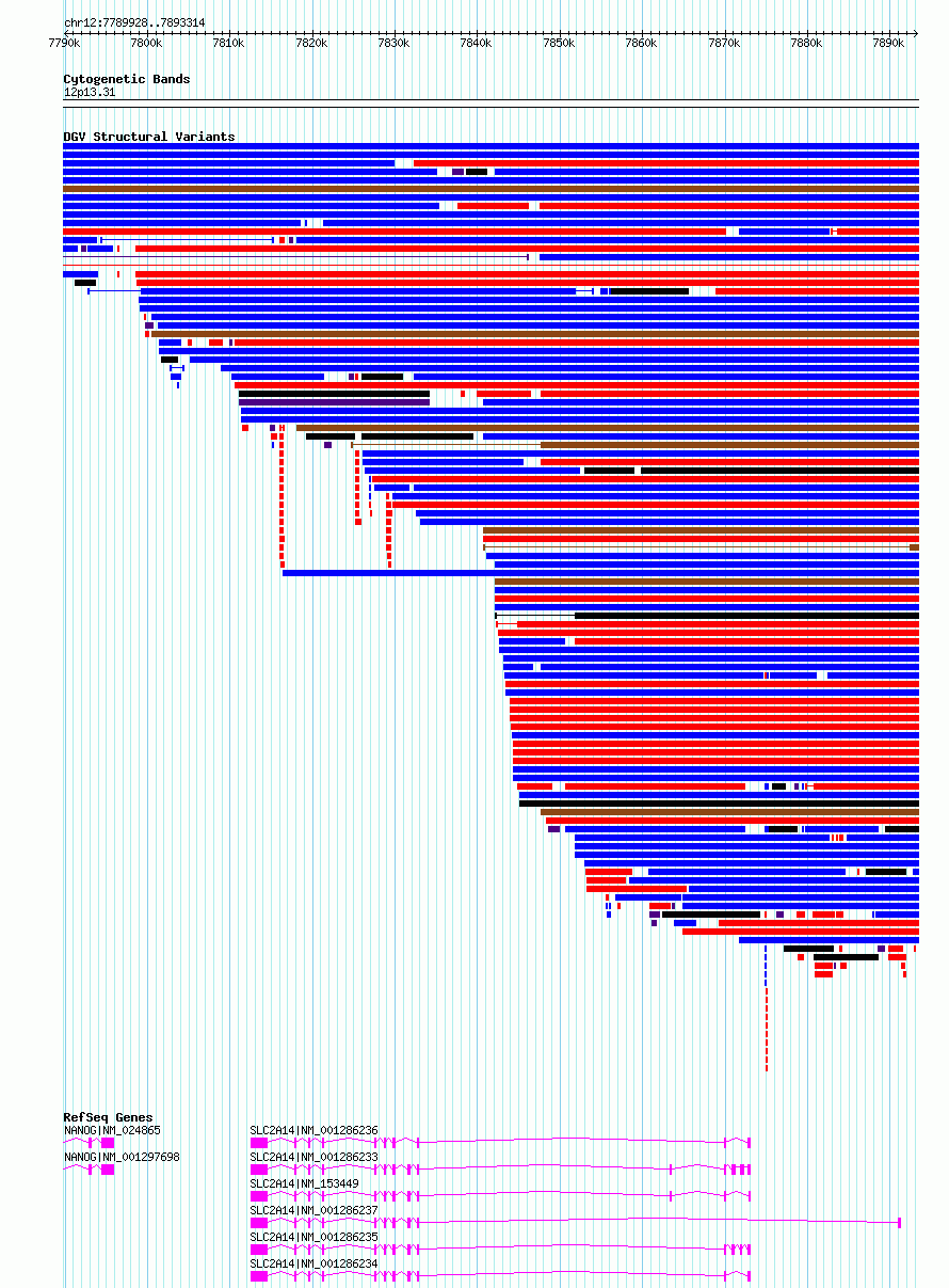 | | Variant Type | CNV deletion | | Copy Number | | | Allele State | | | Allele Origin | | | Probe Count | | | Validation Flag | | | Merged Status | S | | Merged Variants | esv2745493 | | Supporting Variants | | | Samples | SSM016 | | Known Genes | NANOG, SLC2A14 | | Method | Sequencing | | Analysis | Breakdancer:4 times standard deviation,VariationHunter:4 times standard deviation and at least 3 supportting reads | | Platform | Illumina HiSeq 2000 | | Comments | | | Reference | Wong_et_al_2012b | | Pubmed ID | 23290073 | | Accession Number(s) | essv6916091