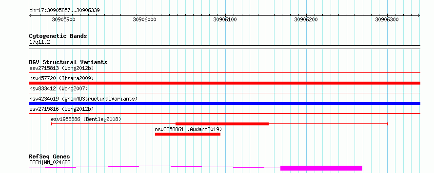 Variant DetailsVariant: essv6916767| Internal ID | 9680982 | | Landmark | | | Location Information | | | Cytoband | 17q11.2 | | Allele length | | Assembly | Allele length | | hg38 | 483 | | hg19 | 483 |