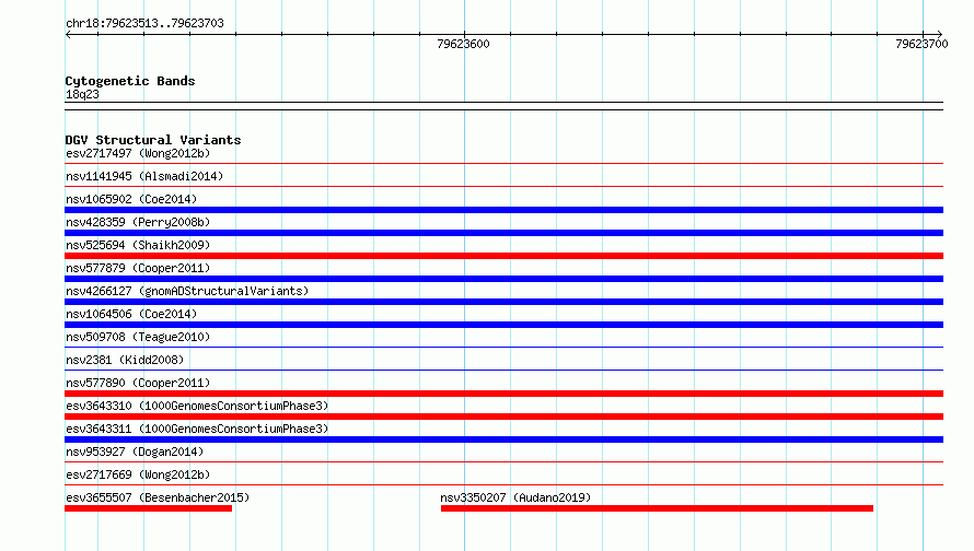 Variant DetailsVariant: essv6916936| Internal ID | 9678070 | | Landmark | | | Location Information | | | Cytoband | 18q23 | | Allele length | | Assembly | Allele length | | hg38 | 191 | | hg19 | 191 |