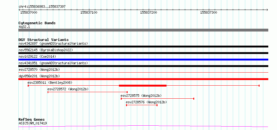 | | Variant Type | CNV deletion | | Copy Number | | | Allele State | | | Allele Origin | | | Probe Count | | | Validation Flag | | | Merged Status | S | | Merged Variants | esv2728570, esv2728571 | | Supporting Variants | | | Samples | SSM017 | | Known Genes | ASIC5 | | Method | Sequencing | | Analysis | Breakdancer:4 times standard deviation,VariationHunter:4 times standard deviation and at least 3 supportting reads | | Platform | Illumina HiSeq 2000 | | Comments | | | Reference | Wong_et_al_2012b | | Pubmed ID | 23290073 | | Accession Number(s) | essv6918358
