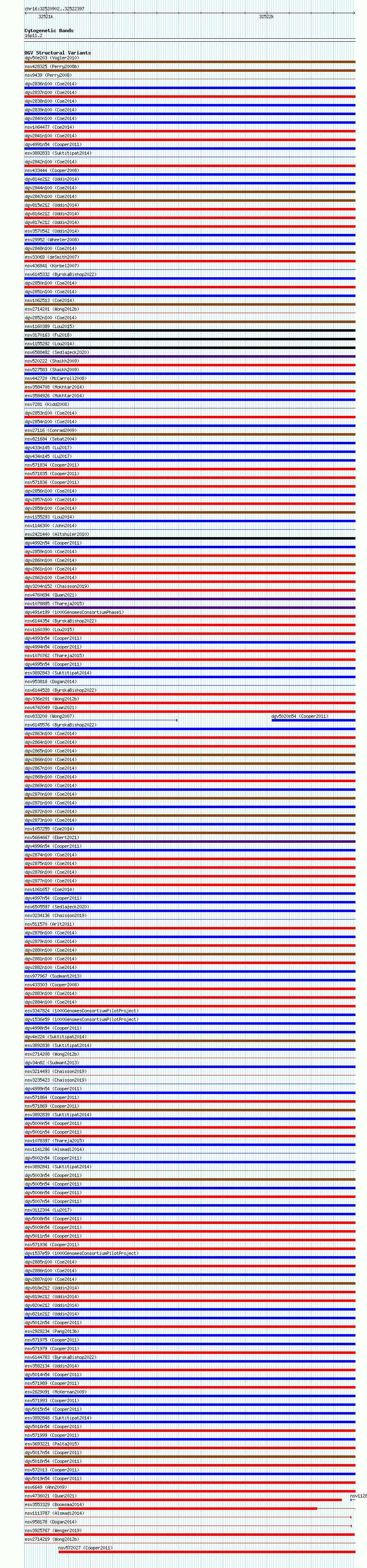 Variant DetailsVariant: essv6920750| Internal ID | 10030952 | | Landmark | | | Location Information | | | Cytoband | 16p11.2 | | Allele length | | Assembly | Allele length | | hg38 | 1496 | | hg19 | 1496 |
