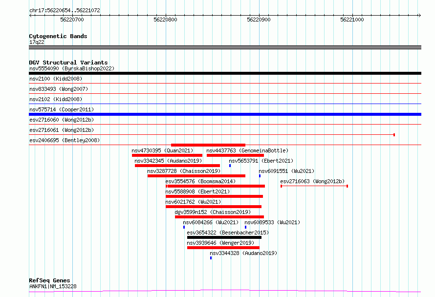 Variant DetailsVariant: essv6920961| Internal ID | 10031142 | | Landmark | | | Location Information | | | Cytoband | 17q22 | | Allele length | | Assembly | Allele length | | hg38 | 419 | | hg19 | 419 |