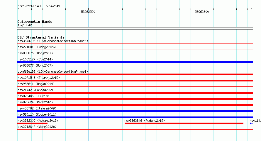 Variant DetailsVariant: essv6921430| Internal ID | 9684877 | | Landmark | | | Location Information | | | Cytoband | 19q13.42 | | Allele length | | Assembly | Allele length | | hg38 | 206 | | hg19 | 206 |