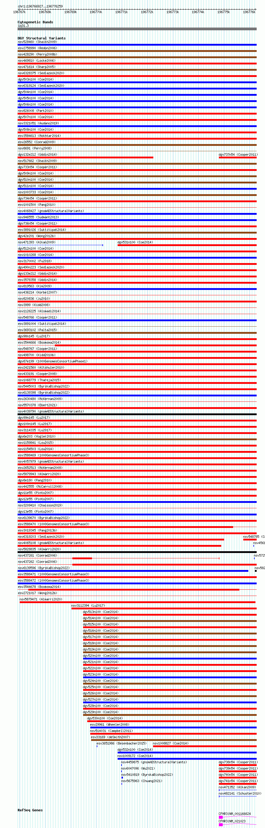 Variant DetailsVariant: essv6921882| Internal ID | 10034558 | | Landmark | | | Location Information | | | Cytoband | 1q31.3 | | Allele length | | Assembly | Allele length | | hg38 | 9333 | | hg19 | 9333 |