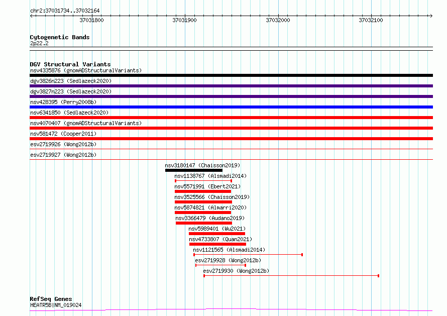 Variant DetailsVariant: essv6922043| Internal ID | 10034737 | | Landmark | | | Location Information | | | Cytoband | 2p22.2 | | Allele length | | Assembly | Allele length | | hg38 | 431 | | hg19 | 431 |