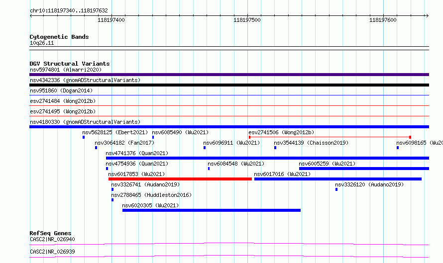 Variant DetailsVariant: essv6924079| Internal ID | 10033425 | | Landmark | | | Location Information | | | Cytoband | 10q26.11 | | Allele length | | Assembly | Allele length | | hg38 | 293 | | hg19 | 293 |
