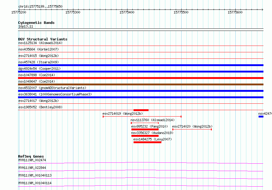 Variant DetailsVariant: essv6924838| Internal ID | 9687582 | | Landmark | | | Location Information | | | Cytoband | 16p13.11 | | Allele length | | Assembly | Allele length | | hg38 | 452 | | hg19 | 452 |