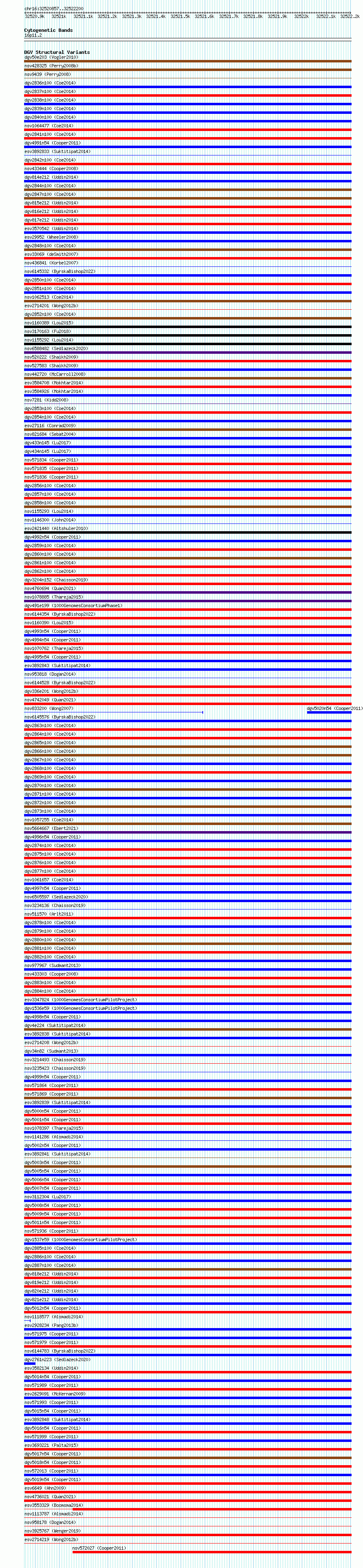 Variant DetailsVariant: essv6924861| Internal ID | 10034294 | | Landmark | | | Location Information | | | Cytoband | 16p11.2 | | Allele length | | Assembly | Allele length | | hg38 | 1344 | | hg19 | 1344 |