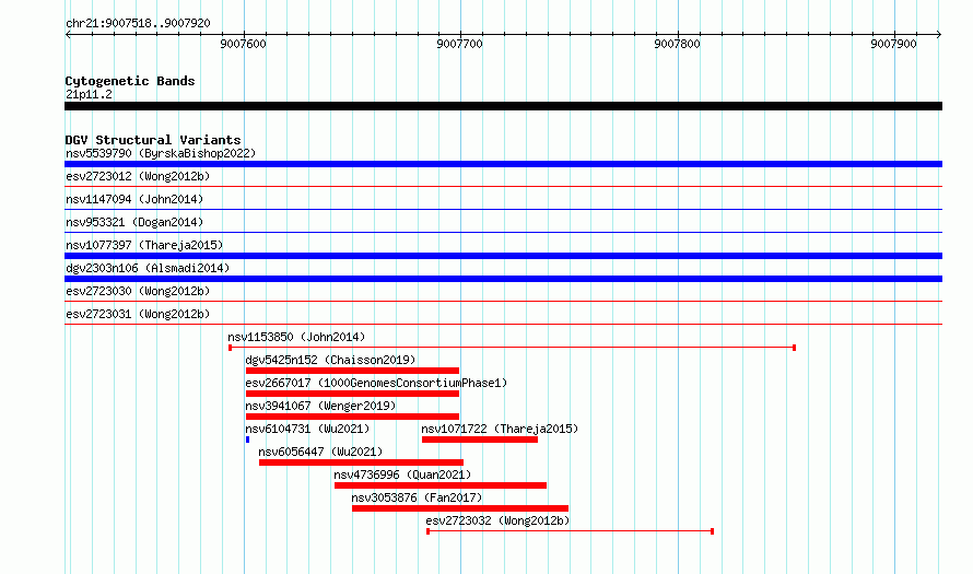Variant DetailsVariant: essv6925557| Internal ID | 10032645 | | Landmark | | | Location Information | | | Cytoband | 21p11.2 | | Allele length | | Assembly | Allele length | | hg38 | 403 | | hg19 | 403 |