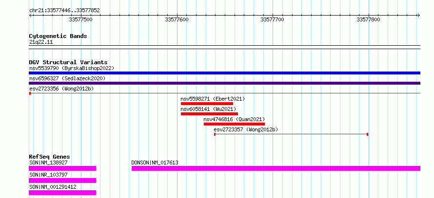 | | Variant Type | CNV deletion | | Copy Number | | | Allele State | | | Allele Origin | | | Probe Count | | | Validation Flag | | | Merged Status | S | | Merged Variants | esv2723356 | | Supporting Variants | | | Samples | SSM018 | | Known Genes | DONSON, SON | | Method | Sequencing | | Analysis | Breakdancer:4 times standard deviation,VariationHunter:4 times standard deviation and at least 3 supportting reads | | Platform | Illumina HiSeq 2000 | | Comments | | | Reference | Wong_et_al_2012b | | Pubmed ID | 23290073 | | Accession Number(s) | essv6925592