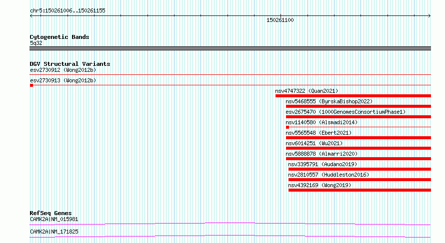 Variant DetailsVariant: essv6926653| Internal ID | 10036072 | | Landmark | | | Location Information | | | Cytoband | 5q32 | | Allele length | | Assembly | Allele length | | hg38 | 150 | | hg19 | 150 |