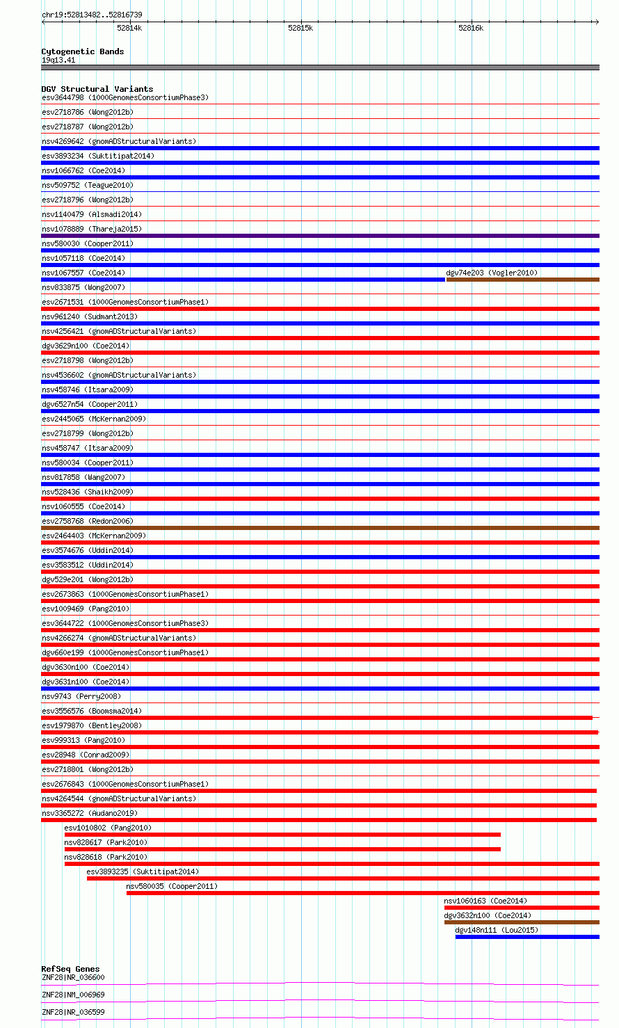 | | Variant Type | CNV deletion | | Copy Number | | | Allele State | | | Allele Origin | | | Probe Count | | | Validation Flag | | | Merged Status | S | | Merged Variants | esv2718798, esv2718787, esv2718800, esv2718801, esv2718786, esv2718796, esv2718799 | | Supporting Variants | | | Samples | SSM019 | | Known Genes | ZNF28 | | Method | Sequencing | | Analysis | Breakdancer:4 times standard deviation,VariationHunter:4 times standard deviation and at least 3 supportting reads | | Platform | Illumina HiSeq 2000 | | Comments | | | Reference | Wong_et_al_2012b | | Pubmed ID | 23290073 | | Accession Number(s) | essv6928825