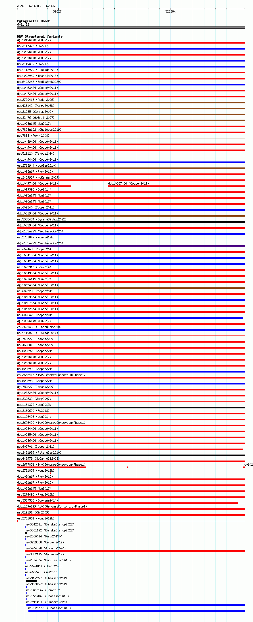 Variant DetailsVariant: essv6930425| Internal ID | 10040100 | | Landmark | | | Location Information | | | Cytoband | 6p21.32 | | Allele length | | Assembly | Allele length | | hg38 | 2030 | | hg19 | 2030 |