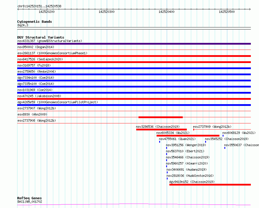 Variant DetailsVariant: essv6931247| Internal ID | 10039738 | | Landmark | | | Location Information | | | Cytoband | 8q24.3 | | Allele length | | Assembly | Allele length | | hg38 | 388 | | hg19 | 388 |