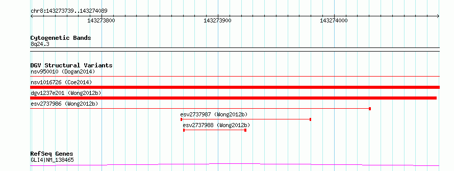 | Variant Type | CNV deletion | Copy Number | | Allele State | | Allele Origin | | Probe Count | | Validation Flag | | Merged Status | S | Merged Variants | esv2737985, esv2737982 | Supporting Variants | | Samples | SSM020 | Known Genes | GLI4 | Method | Sequencing | Analysis | Breakdancer:4 times standard deviation,VariationHunter:4 times standard deviation and at least 3 supportting reads | Platform | Illumina HiSeq 2000 | Comments | | Reference | Wong_et_al_2012b | Pubmed ID | 23290073 | Accession Number(s) | essv6931249
