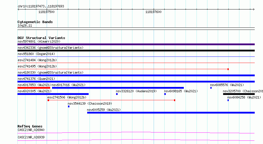 | | Variant Type | CNV deletion | | Copy Number | | | Allele State | | | Allele Origin | | | Probe Count | | | Validation Flag | | | Merged Status | S | | Merged Variants | esv2741495, esv2741484 | | Supporting Variants | | | Samples | SSM020 | | Known Genes | CASC2 | | Method | Sequencing | | Analysis | Breakdancer:4 times standard deviation,VariationHunter:4 times standard deviation and at least 3 supportting reads | | Platform | Illumina HiSeq 2000 | | Comments | | | Reference | Wong_et_al_2012b | | Pubmed ID | 23290073 | | Accession Number(s) | essv6931564