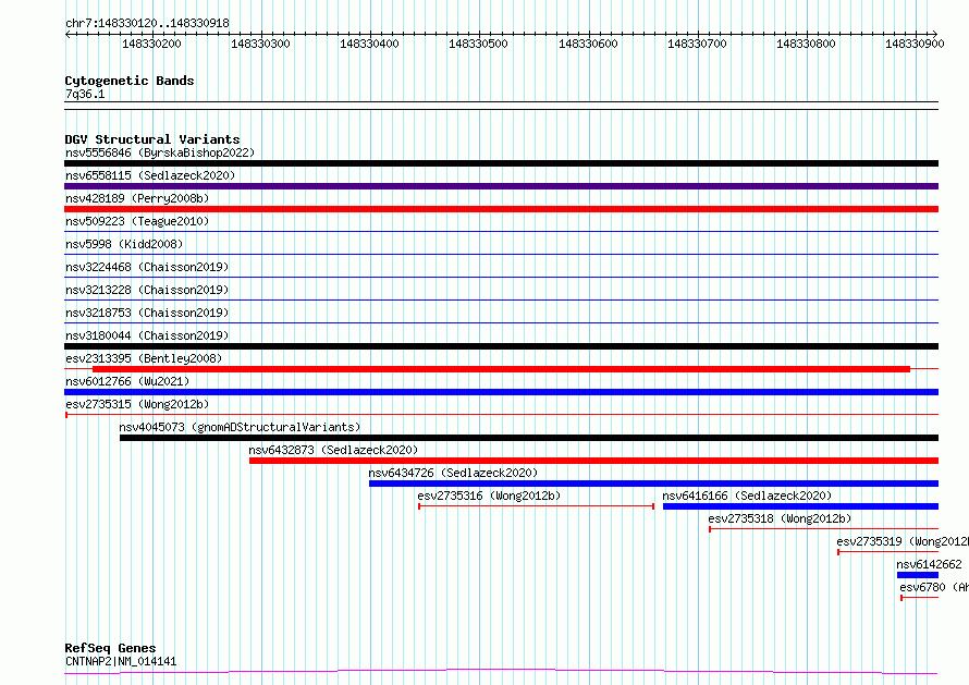 | | Variant Type | CNV deletion | | Copy Number | | | Allele State | | | Allele Origin | | | Probe Count | | | Validation Flag | | | Merged Status | S | | Merged Variants | esv2735315 | | Supporting Variants | | | Samples | SSM021 | | Known Genes | CNTNAP2, MIR548T | | Method | Sequencing | | Analysis | Breakdancer:4 times standard deviation,VariationHunter:4 times standard deviation and at least 3 supportting reads | | Platform | Illumina HiSeq 2000 | | Comments | | | Reference | Wong_et_al_2012b | | Pubmed ID | 23290073 | | Accession Number(s) | essv6935132
