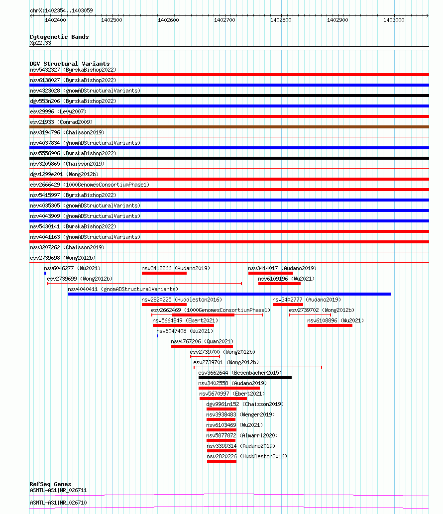 Variant DetailsVariant: essv6935225| Internal ID | 10044035 | | Landmark | | | Location Information | | | Cytoband | Xp22.33 | | Allele length | | Assembly | Allele length | | hg38 | 706 | | hg19 | 706 |