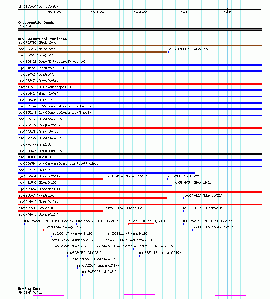 Variant DetailsVariant: essv6935933| Internal ID | 10044898 | | Landmark | | | Location Information | | | Cytoband | 11p15.4 | | Allele length | | Assembly | Allele length | | hg38 | 562 | | hg19 | 562 |