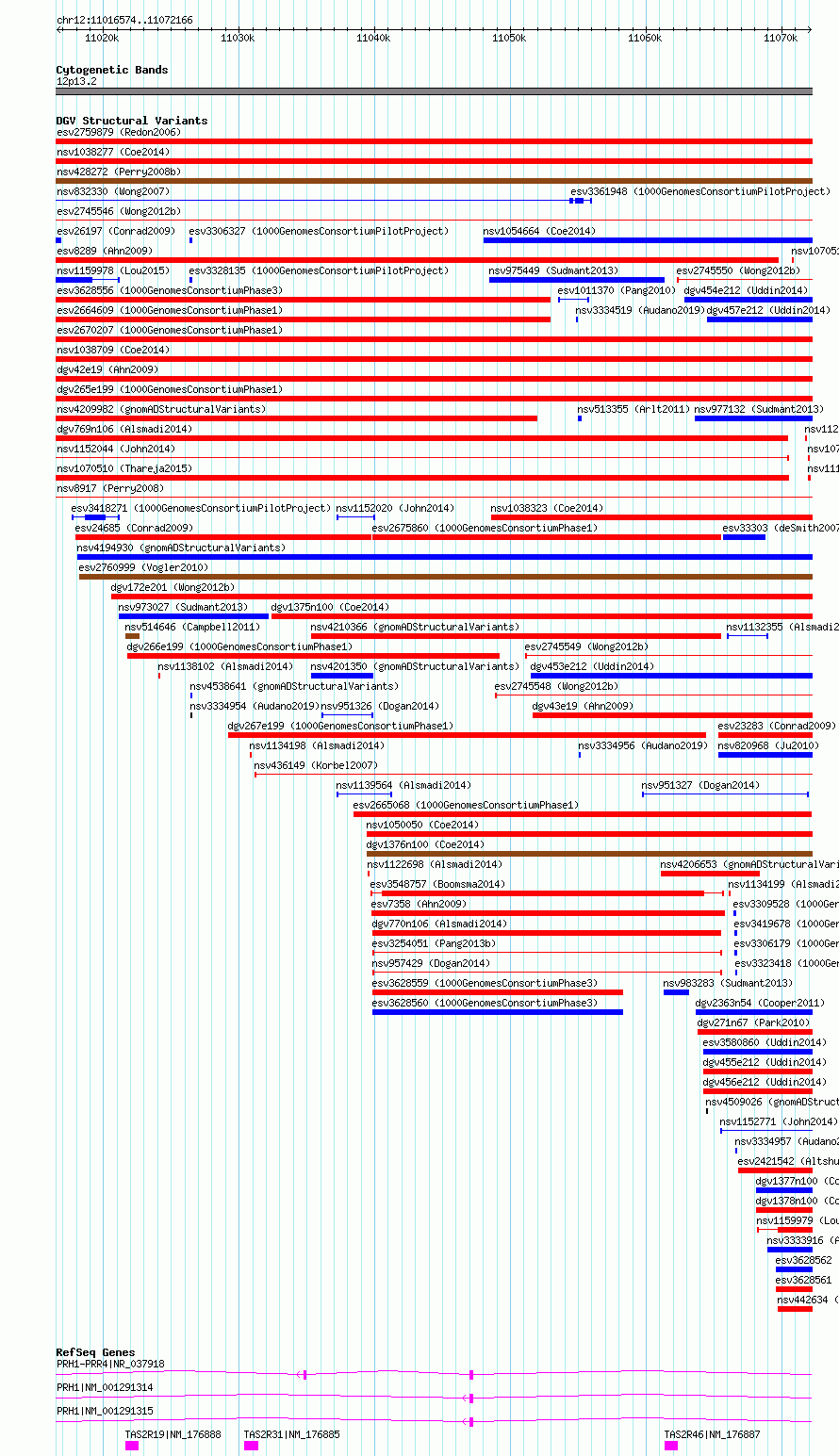 Variant DetailsVariant: essv6936102| Internal ID | 9698425 | | Landmark | | | Location Information | | | Cytoband | 12p13.2 | | Allele length | | Assembly | Allele length | | hg38 | 55593 | | hg19 | 55593 |