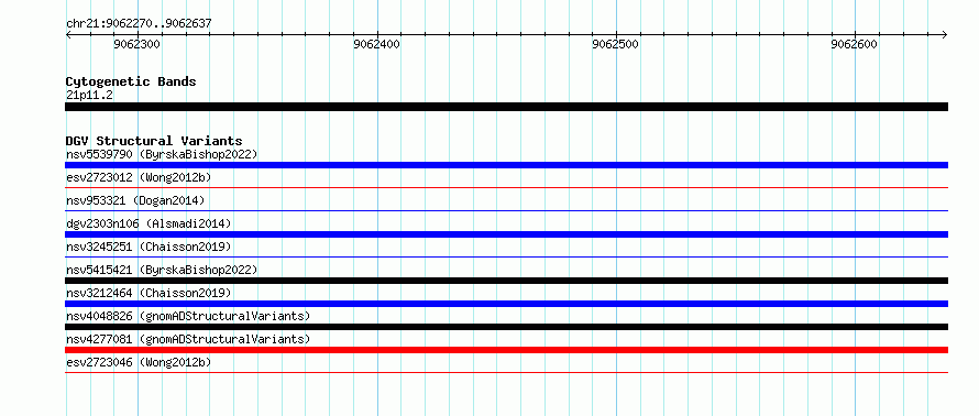 Variant DetailsVariant: essv6937526| Internal ID | 10043011 | | Landmark | | | Location Information | | | Cytoband | 21p11.2 | | Allele length | | Assembly | Allele length | | hg38 | 368 | | hg19 | 368 |