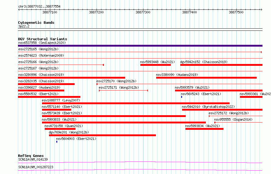 | | Variant Type | CNV deletion | | Copy Number | | | Allele State | | | Allele Origin | | | Probe Count | | | Validation Flag | | | Merged Status | S | | Merged Variants | esv2725165, esv2725167 | | Supporting Variants | | | Samples | SSM022 | | Known Genes | SCN11A | | Method | Sequencing | | Analysis | Breakdancer:4 times standard deviation,VariationHunter:4 times standard deviation and at least 3 supportting reads | | Platform | Illumina HiSeq 2000 | | Comments | | | Reference | Wong_et_al_2012b | | Pubmed ID | 23290073 | | Accession Number(s) | essv6938214