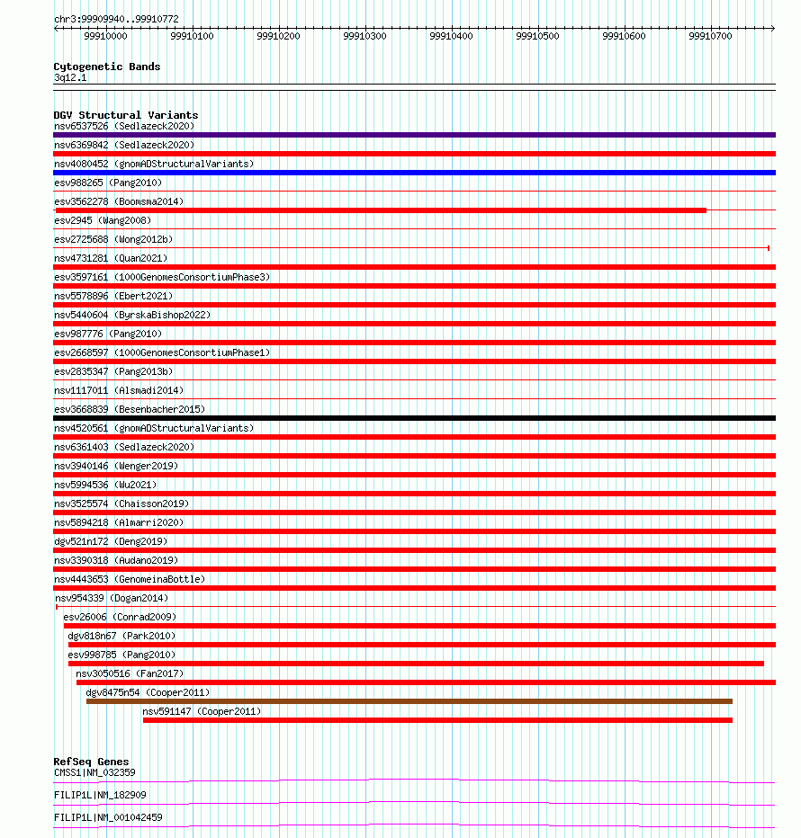 Variant DetailsVariant: essv6938279| Internal ID | 10046652 | | Landmark | | | Location Information | | | Cytoband | 3q12.1 | | Allele length | | Assembly | Allele length | | hg38 | 833 | | hg19 | 833 |