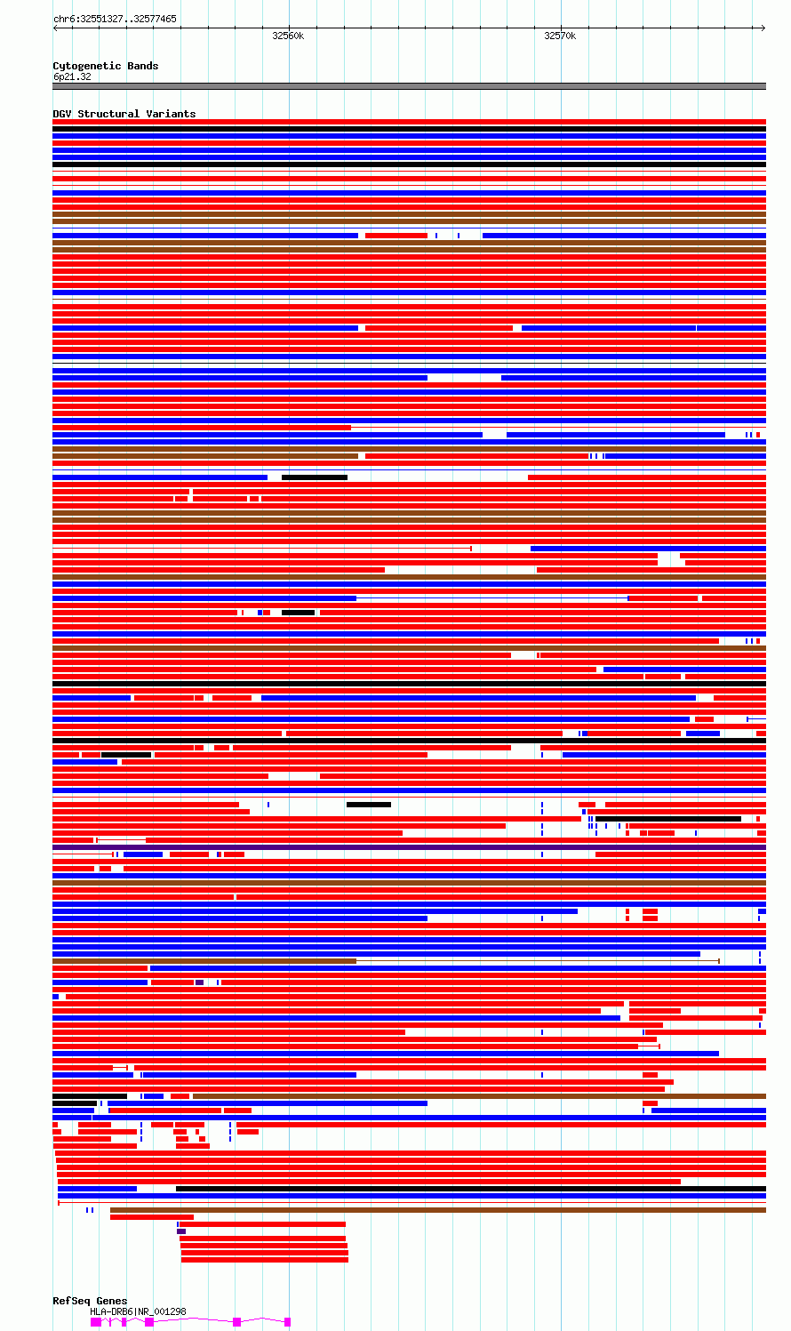 Variant DetailsVariant: essv6939002| Internal ID | 10045973 | | Landmark | | | Location Information | | | Cytoband | 6p21.32 | | Allele length | | Assembly | Allele length | | hg38 | 26139 | | hg19 | 26139 |