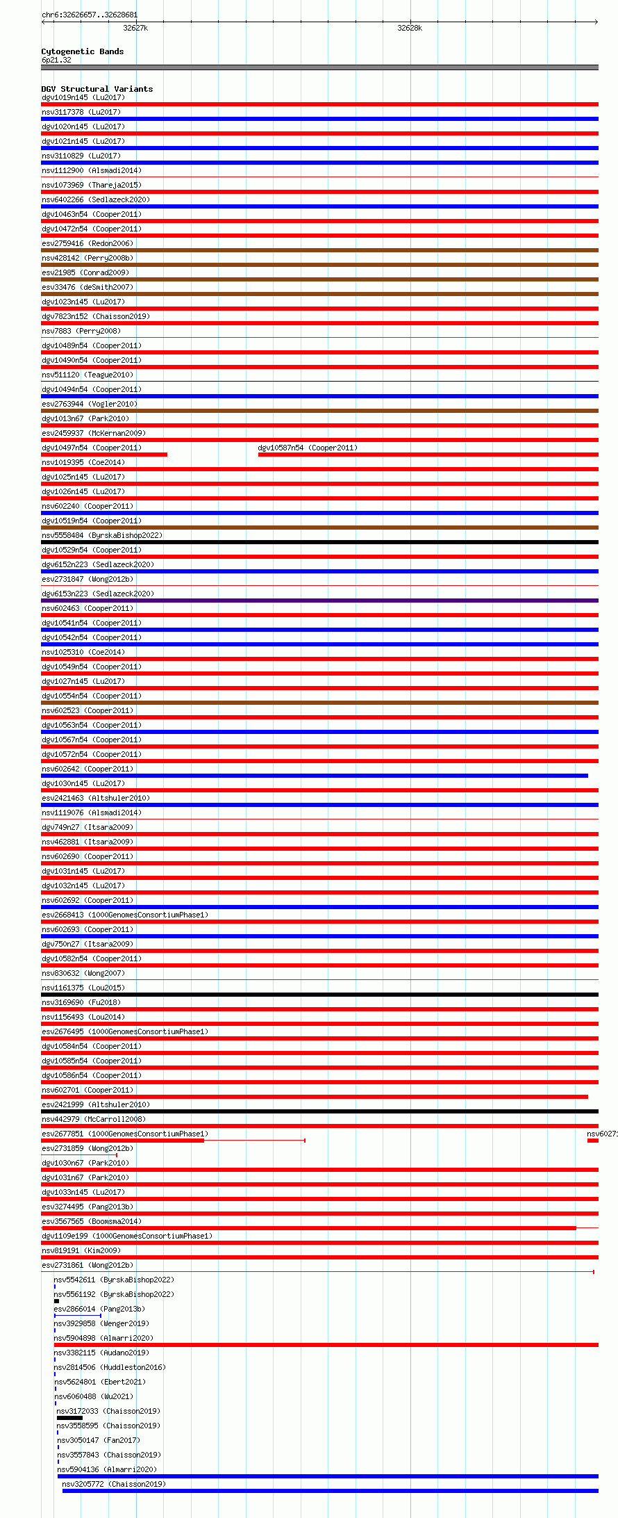 Variant DetailsVariant: essv6939007| Internal ID | 10049447 | | Landmark | | | Location Information | | | Cytoband | 6p21.32 | | Allele length | | Assembly | Allele length | | hg38 | 2025 | | hg19 | 2025 |