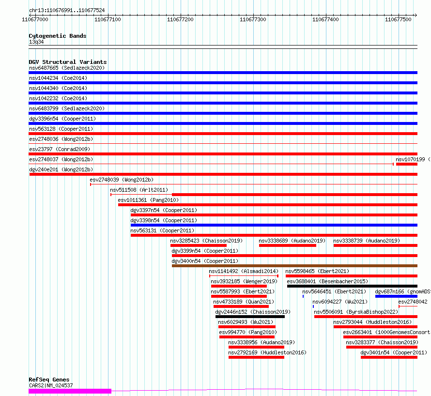 Variant DetailsVariant: essv6940561| Internal ID | 10048271 | | Landmark | | | Location Information | | | Cytoband | 13q34 | | Allele length | | Assembly | Allele length | | hg38 | 534 | | hg19 | 534 |