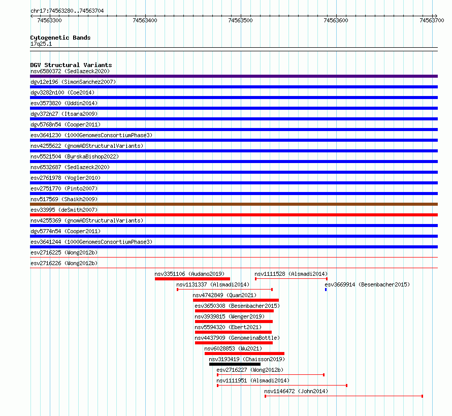 Variant DetailsVariant: essv6941119| Internal ID | 10049037 | | Landmark | | | Location Information | | | Cytoband | 17q25.1 | | Allele length | | Assembly | Allele length | | hg38 | 425 | | hg19 | 425 |