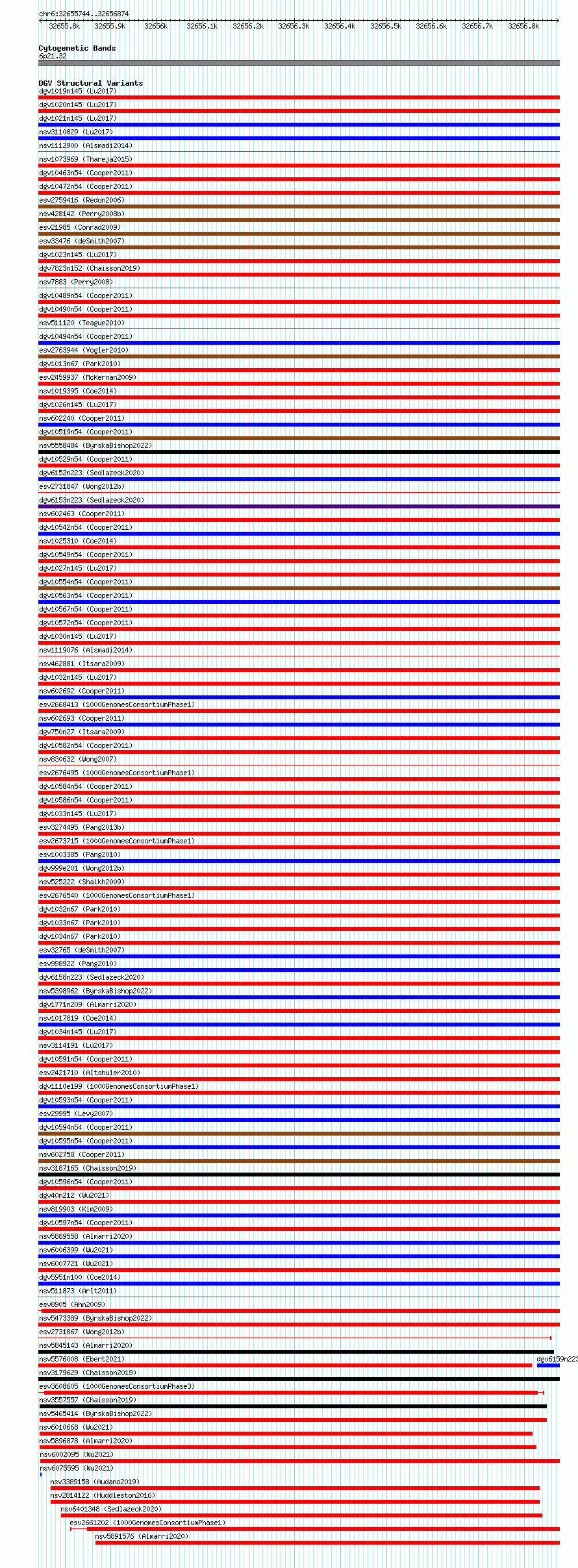 Variant DetailsVariant: essv6943422| Internal ID | 10051980 | | Landmark | | | Location Information | | | Cytoband | 6p21.32 | | Allele length | | Assembly | Allele length | | hg38 | 1131 | | hg19 | 1131 |