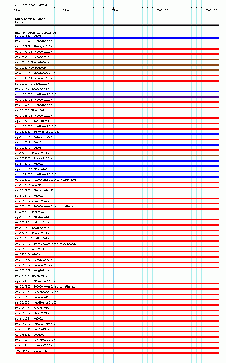 Variant DetailsVariant: essv6943424| Internal ID | 10051983 | | Landmark | | | Location Information | | | Cytoband | 6p21.32 | | Allele length | | Assembly | Allele length | | hg38 | 415 | | hg19 | 415 |