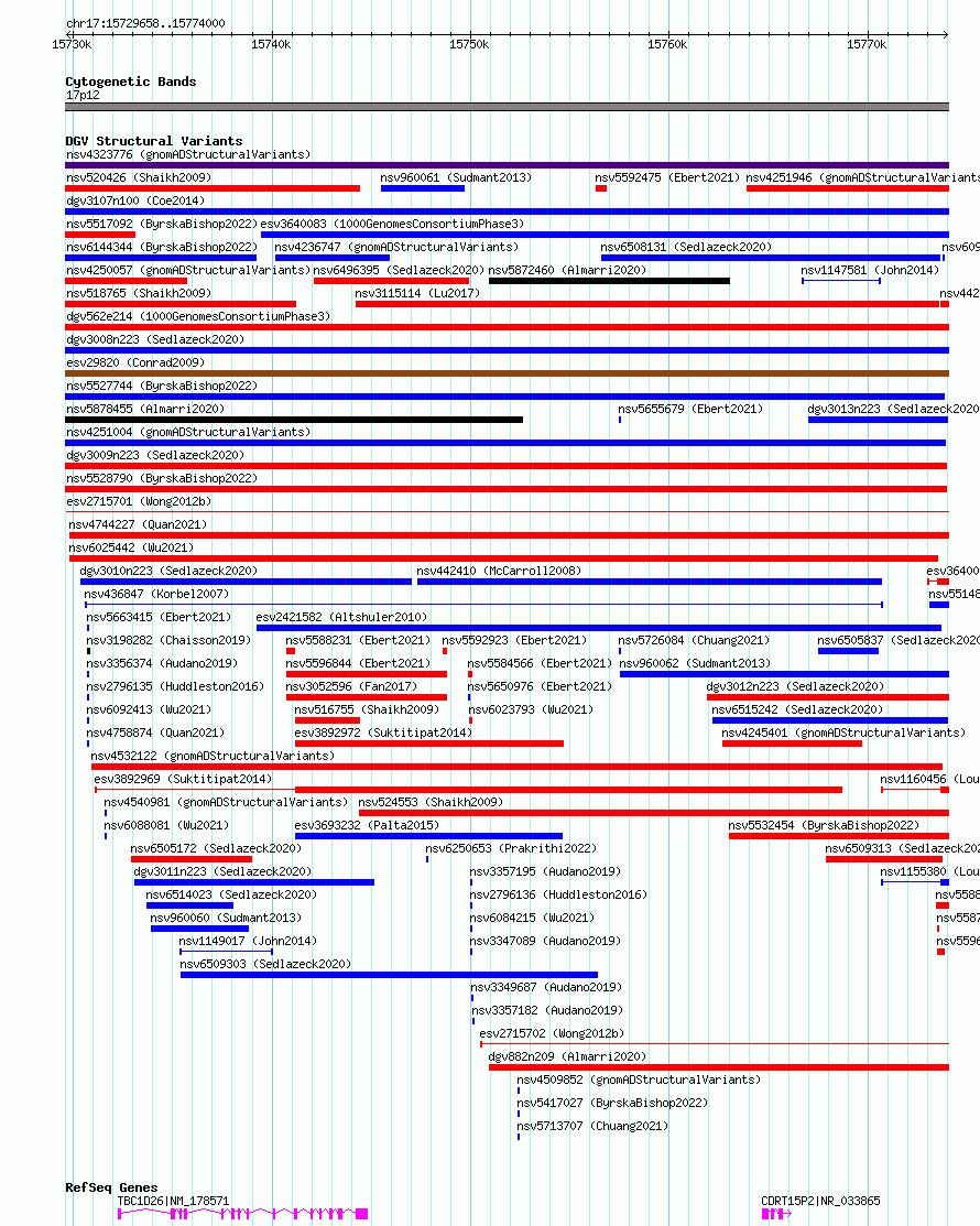 Variant DetailsVariant: essv6944228| Internal ID | 9989187 | | Landmark | | | Location Information | | | Cytoband | 17p12 | | Allele length | | Assembly | Allele length | | hg38 | 44343 | | hg19 | 44343 |