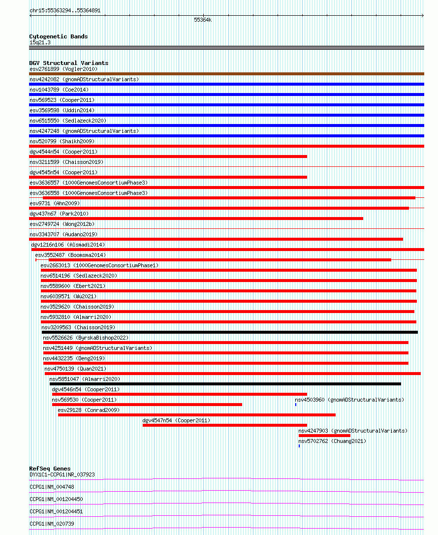| | Variant Type | CNV deletion | | Copy Number | | | Allele State | | | Allele Origin | | | Probe Count | | | Validation Flag | | | Merged Status | S | | Merged Variants | esv2749724 | | Supporting Variants | | | Samples | SSM023 | | Known Genes | CCPG1, DYX1C1-CCPG1 | | Method | Sequencing | | Analysis | Breakdancer:4 times standard deviation,VariationHunter:4 times standard deviation and at least 3 supportting reads | | Platform | Illumina HiSeq 2000 | | Comments | | | Reference | Wong_et_al_2012b | | Pubmed ID | 23290073 | | Accession Number(s) | essv6945416