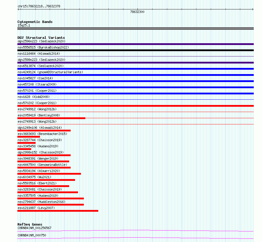 | | Variant Type | CNV deletion | | Copy Number | | | Allele State | | | Allele Origin | | | Probe Count | | | Validation Flag | | | Merged Status | S | | Merged Variants | esv2749912, esv2749913 | | Supporting Variants | | | Samples | SSM023 | | Known Genes | CHRNB4 | | Method | Sequencing | | Analysis | Breakdancer:4 times standard deviation,VariationHunter:4 times standard deviation and at least 3 supportting reads | | Platform | Illumina HiSeq 2000 | | Comments | | | Reference | Wong_et_al_2012b | | Pubmed ID | 23290073 | | Accession Number(s) | essv6945443